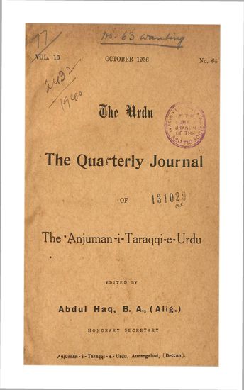 | Subject | : | The Quarterly Journal of The Anjuman - i - Taraqqi - e - Urdu |