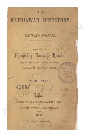 | Subject | : | Directory of Kathiawad region, includes political and geographical information. |