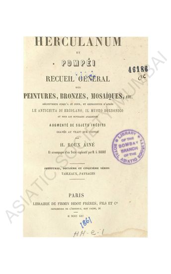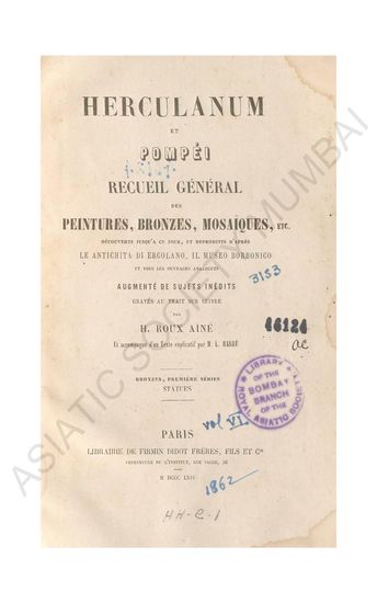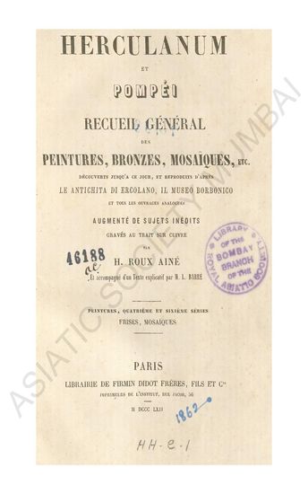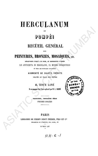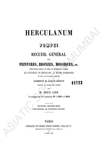 | Subject | : | Herculanum et Pompéi: Recueil général des peintures, bronzes, mosaïques, etc. Découverts jusqu'à ce jour, et reproduits d'après le antichita di Ercolano, il Museo Borbonico et tous les ouvrages analogues. Augmenté de sujets inédits gravés au trait sur cuivre. |