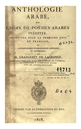 | Subject | : | Anthologie Grammaticale Arabe, ou Morceaux choisis de divers grammairiens et scholastes arabes, avec une traduction française et des notes |