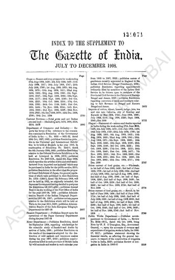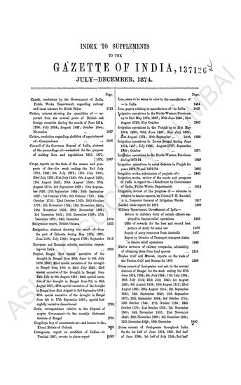 | Subject | : | Index to supplements of the Gazette of India, administration, agriculture, prices of food-grains, general comparative abstract of Indian revenue, experimental cultivation, irrigation experiments |