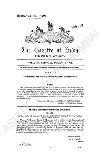 | Subject | : | Advertisements and Notices by Private Individuals and Corporations |