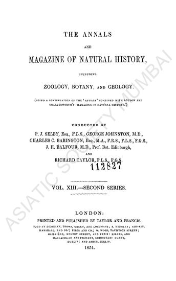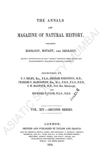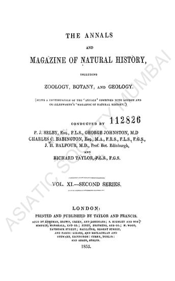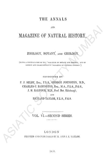 | Subject | : | Natural History - Includes Zoology, Botany, and Geology. Being a continuation of the 'Annals' combined with Charlesworth's 'Magazine of Natural History' |