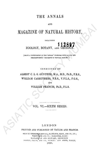| Subject | : | Zoology, Botany, and Geology (Continuing 'Annals' combined with 'Magazine of Natural History') |