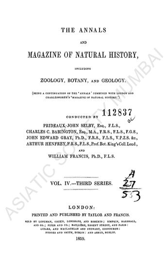 | Subject | : | Natural History, including descriptions and classifications of new genera and species, paleontology, zoology, and related topics |