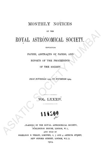 | Publisher | : | Royal Astronomical Society, Burlington House, London, W. 1, and Wheldon & Wesley, Limited, 2, 3 and 4 Arthur Street, New Oxford Street, London, W. C. 2. |