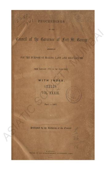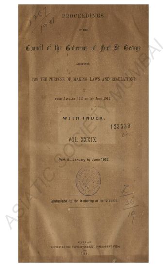 Proceedings of a Meeting of the Council of the Governor of Fort St. George assembled for the purpose of making Laws and Regulations under the provisions of the Act of Parliament 5 & 6 gec. V, Ch 61…