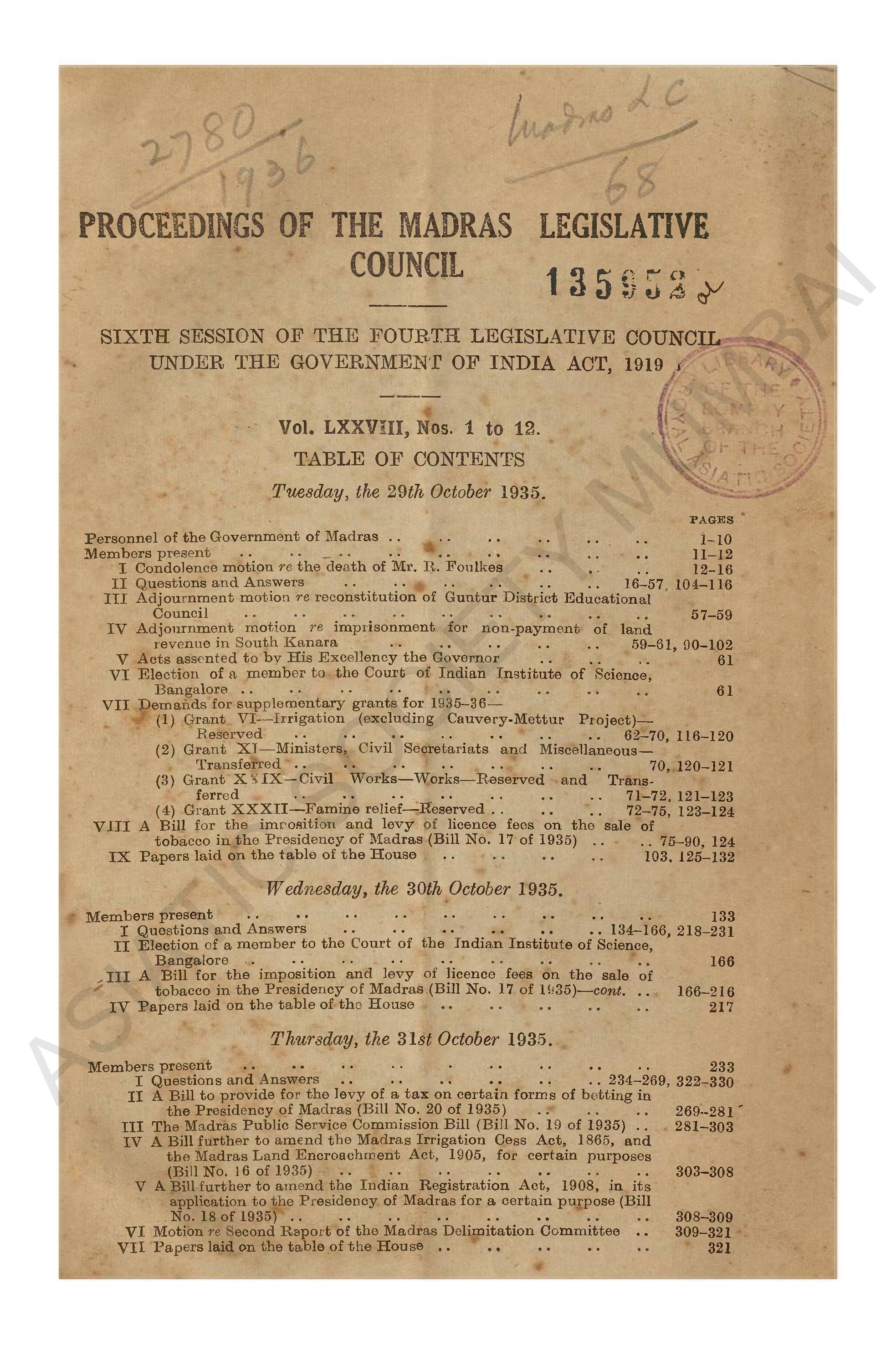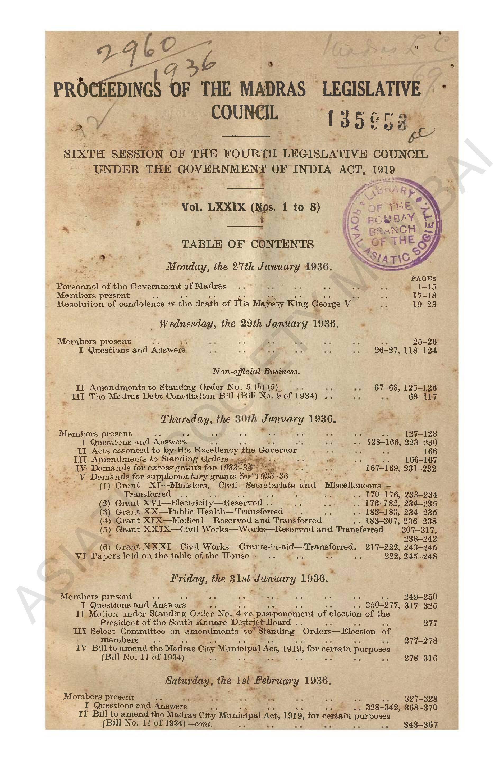 Proceedings of the Madras Legislative Council Fifth Session of the Fourth Legislative Council Under the Government of India Act, 1919, Vol LXXIV (Nos 1 to 9) - Vol LXXV, 1935, Table of Contents Monday the 21st January 1935.
