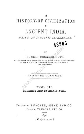 A History of Civilization in Ancient India, in 3 Vols., Vol.III: Buddhist and Pauranik Ages:Based on Sanscrit Literature