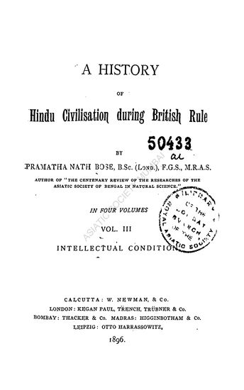 A History of Hindu Civilisation During the British Rule, in 4 Vols. Intellectual Condition Vol. III