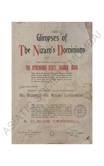 Glimpses of the Nizam's Domnions; being an exahaustive photographic history of the Hyderabad State, Deccan, India; with nearly 600 superbly reproduced views of Peoples, Cities, Towers, Mosques, Cave Temples, Forts, Tombs, Ruins, Palaces, Public Buildings and Natural Wonders, all of which have been specially taken for the purpose by high-class photographers