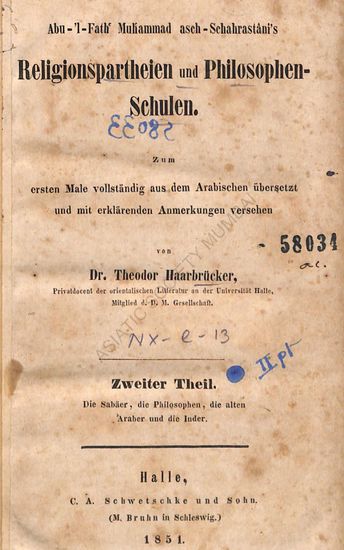Schahrastani's, Abu-l-Fath Muhammad; Haarbrucker et al.