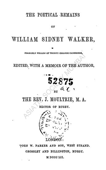 The Poetical Remains of William Sidney Walker, edited with a Memoir of the Author