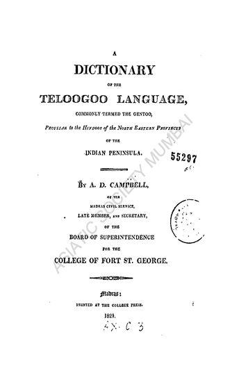 A Dictionary of the Teloogoo Language; commonly termed the Gentoo Peculliar to the Hindoos of the North Eastern Provinces of the Indian Penninsula