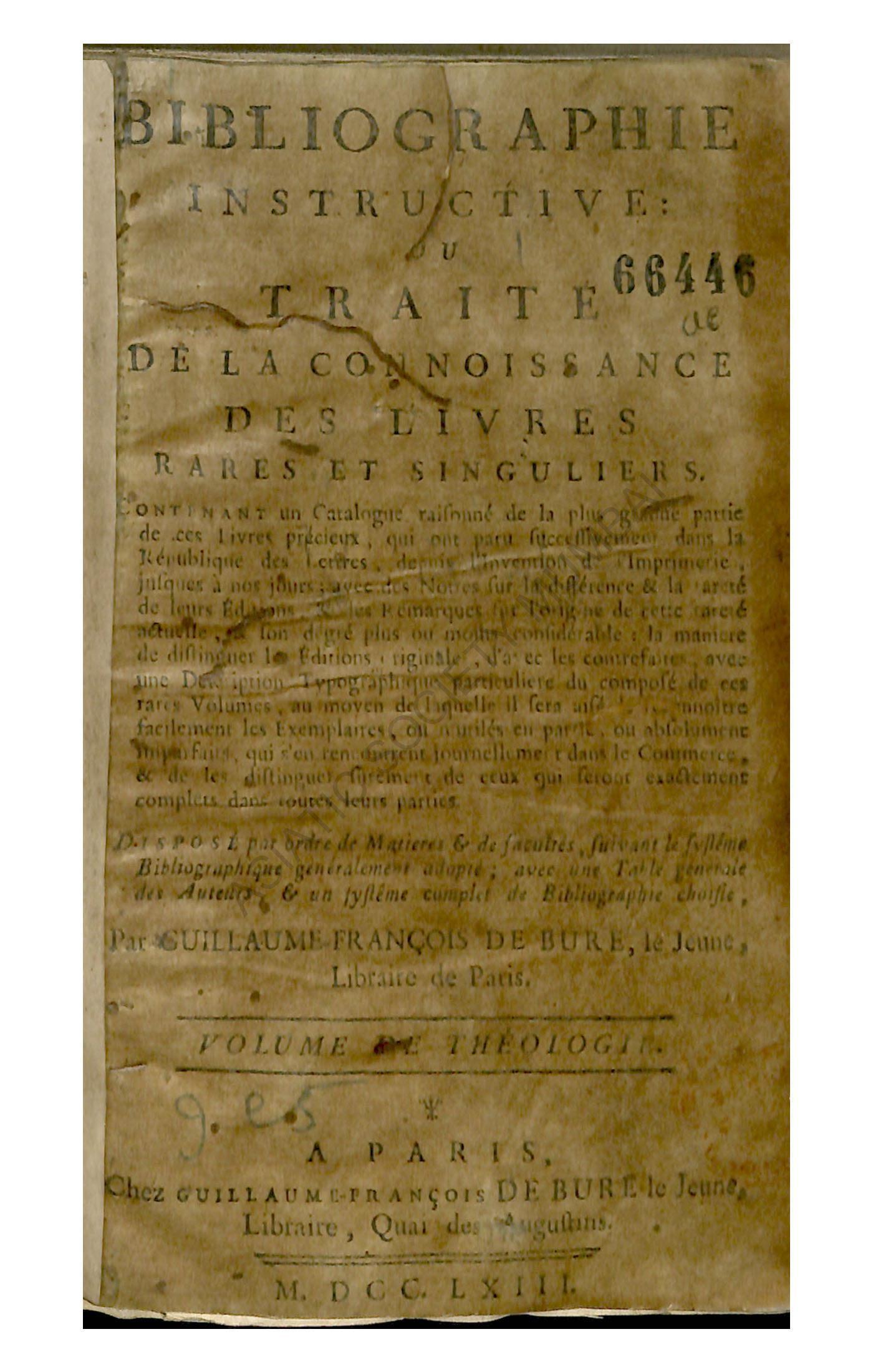 Bibliographie Instructive; ou Traite de la Connoissance des Livres Rares et Singuliers, Volume de Theologie