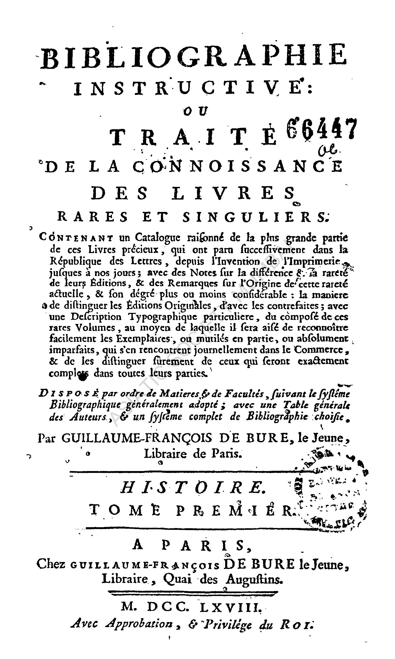 Bibliographie Instructive; ou Traite de la Connoissance des Livres Rares et Singuliers, Histoire, Vol. I