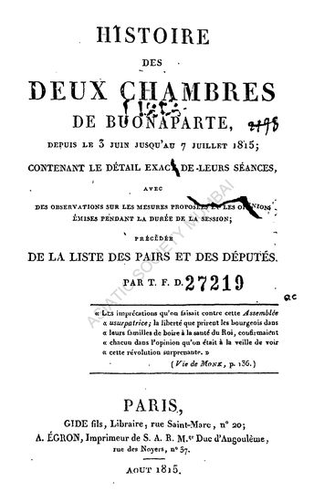 Histoire des deux Chambres de Buonaparte depuis le 3 Juin jusqu'au 7 Juillet 1815