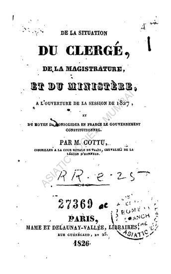 De la Situation du Clerge, de la Magistrature, et du Ministere a l'Ouverture de la Session de 1827
