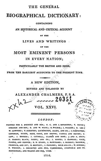 The General Biographical Dictionary; containing an Historical and Critical Account of the Lives and Writings of the most Eminent Persons in every Nation; particularly the British and Irish, from the Earliest Accounts to the Present Time, in Thirty-Two Volumes, New ed., Vol. VII