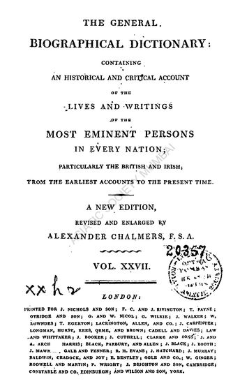 The General Biographical Dictionary; containing an Historical and Critical Account of the Lives and Writings of the most Eminent Persons in every Nation; particularly the British and Irish, from the Earliest Accounts to the Present Time, in Thirty-Two Volumes, New ed., Vol. XXVII
