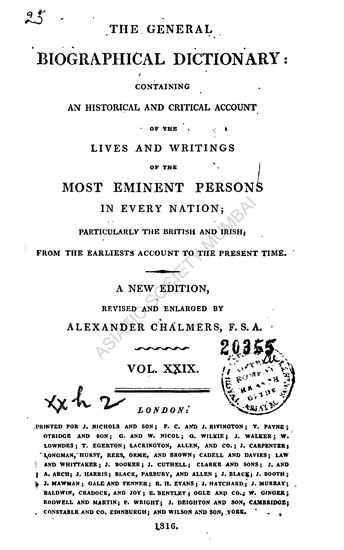 The General Biographical Dictionary; containing an Historical and Critical Account of the Lives and Writings of the most Eminent Persons in every Nation; particularly the British and Irish, from the Earliest Accounts to the Present Time, in Thirty-Two Volumes, New ed., Vol. XXIX