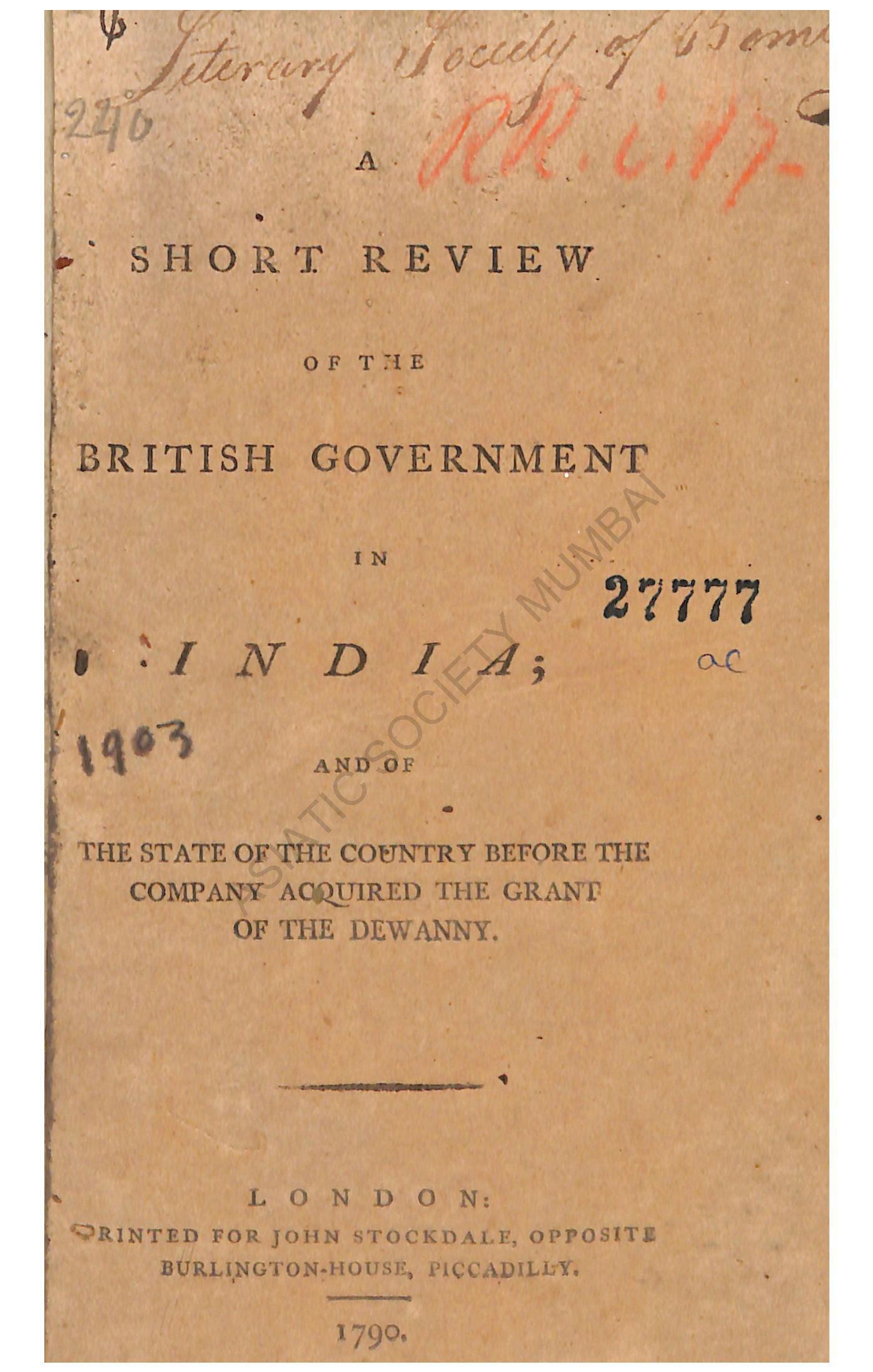 A Short Review of the British Government in India and of the State of the Country before the Company acquired the Grant of the Dewanny