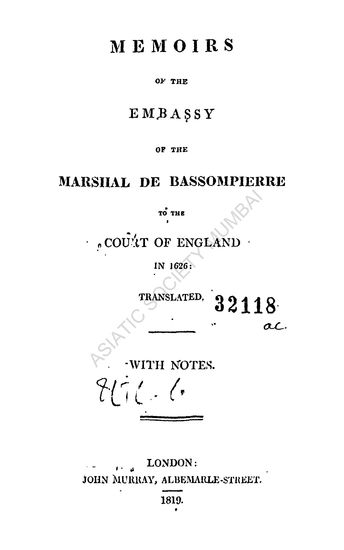 Memoirs of the Embassy of the Marshal de Bassompierre to the Court of England in 1626