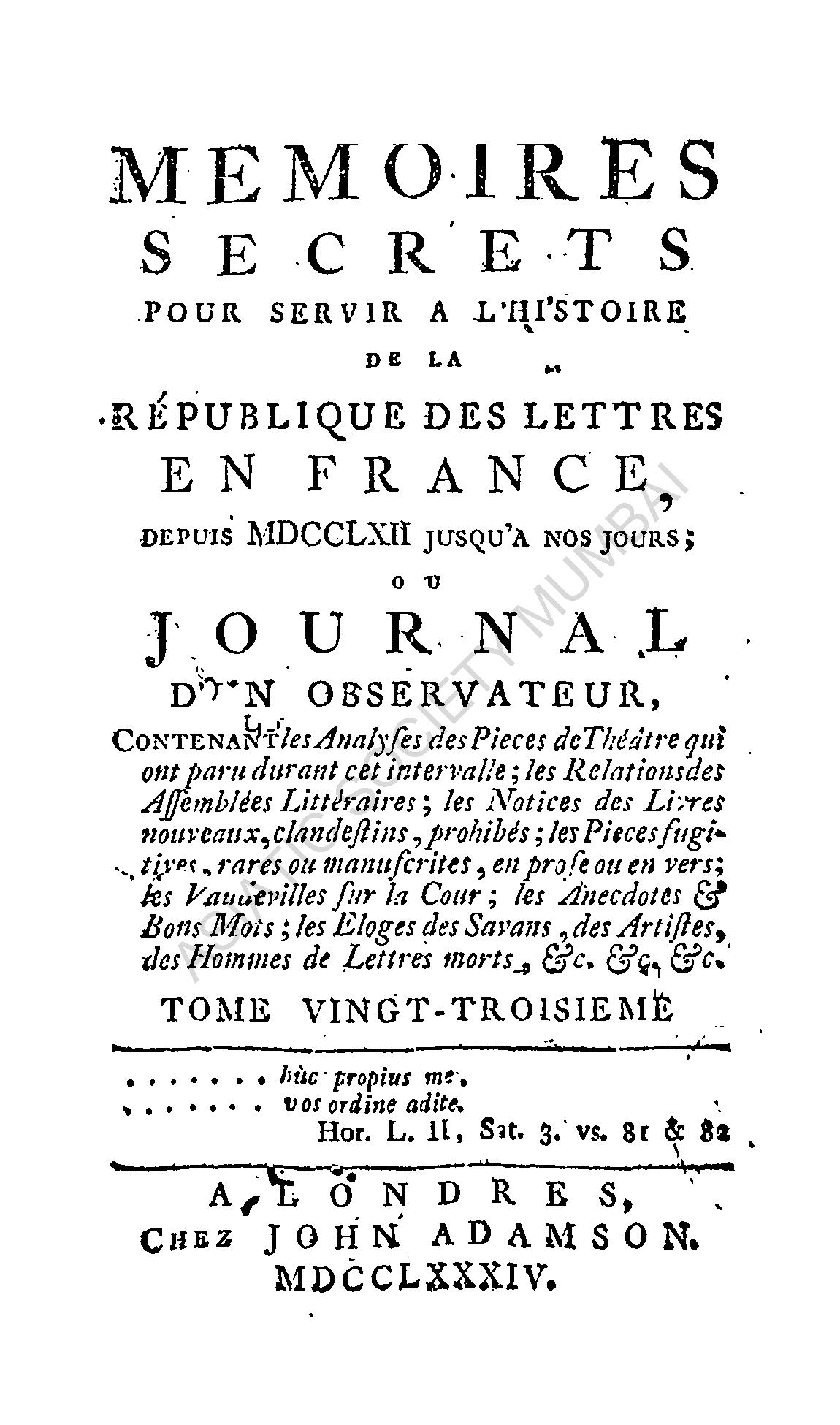 Memories Secrets pour servir a l'Histoire de la Republique des Lettres en France depuis MDCCLXII jusqua nos jours ou Journal d'un Observateur; contenant les analyses des Pieces de Theatre qui ont paru durant cet intervalle; les relations des assemblees Litteraires; les Notices des Livres nouveaux, clandestins, prohibes; les Pieces fugitives, rares ou manuscripts, en prose ou en vers; les Vaudevilles sur la Cour; les Anecdotes & Bons Monts; les Eloges des Savants, des Artistes, des Hommes de Lettres morts, &c. &c. &c., Vol. XXIII