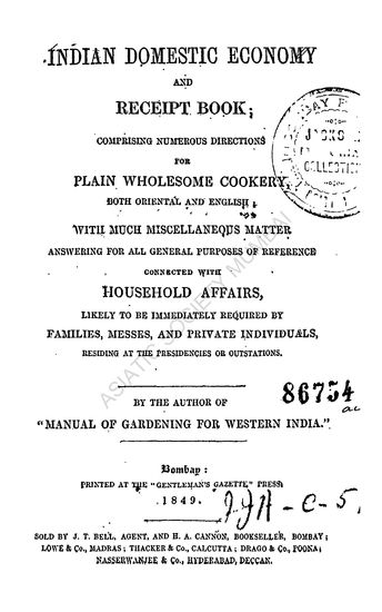 Indian Domestic Economy and Receipt Book, comprising Numerous Directions for Plain Wholesome Cookery both Oriental and English