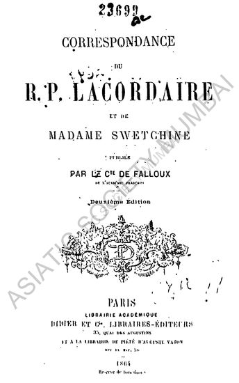 Correspondance du R. P. Lacordaire et de Madame Swetchine, 2nd ed.