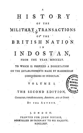 A history of the Military Transactions of the British Nation in Indostan: From the Year MDCCXLV. To which is Prefixed A Dissertation on the Establishments Made by Mahomedan Conquerors in Indostan