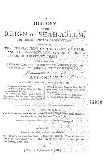 The History of the Reign of Shah - Aulum, the Present Emperor of Hindostaun, Containing the Transactions of the Court of Delhi, and the Neighbouring States During a Period of Thirty Six Years