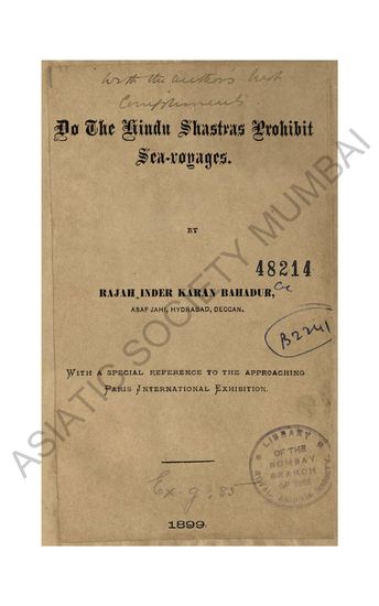 Do the Hindu Shastras Prohibit Sea Voyages; with a special reference to the approaching Paris International Exhibition