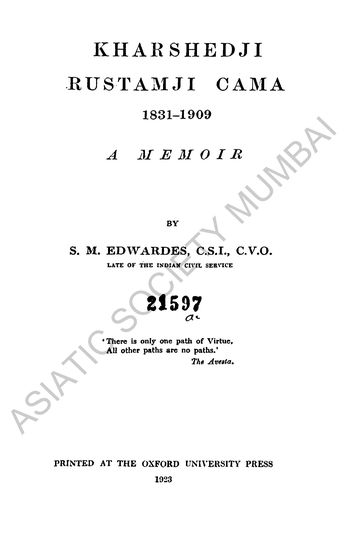 Kharshedji Rustamji Cama 1831-1909, a Memoir