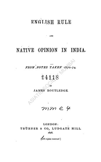 English Rule and Native Opinion in India From Notes Taken, 1870-74