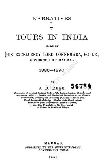 Narratives of Tours in India Made by his Excellency Lord Connemara G. C. I. E. Governor of Madras 1886-1890