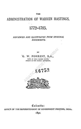 The Administration of Warren Hasting 1772-1785