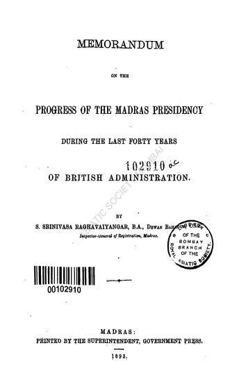 Memorandum on the Progress of the Madras Presidency During the Last Forty Years of British Administration