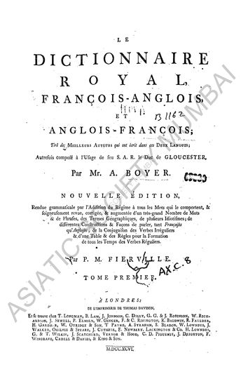The Royal Dictionary, French and English and English and French, extracted from the Writings of the best Authors in both Languages, formerly composed for the use of his Late Royal Highness the Duke of Gloucester, New ed., Vol. II