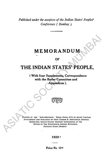 Memorandum of the Indian States People (with four Supplements, Correspondence, with the Butler Committee and Appendices)