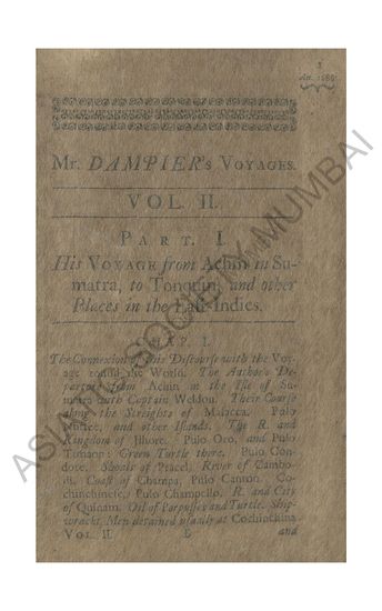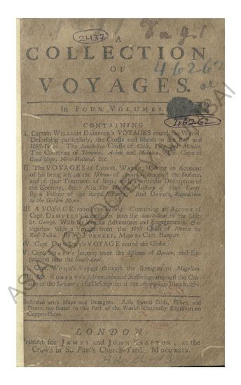 A New Voyage round the World describing particulary the Isthmus of America, several Coasts and Islands in the West Indies, the Isles of Cape Verd, the Passage by Terra del Fuego, the South-Sea Coasts of Chili, Peru and Mexico, the Isle of Guam one of the Ladrones, Mindanao and other Philippine and East-India Islands near Cambodia, China, Formosa, Luconia, Celebes, &c., New Holland, Sumatra, Nicobar Isles, the Cape of Good Hope and Santa Hellena; their Soil, Rivers, Harbours, Plants, Fruits, Animals and Inhabitants, their Customs, Religion, Government, Trade, &c., 7th ed. (A Collection of Voyages), in Four Volumes, Vol. I