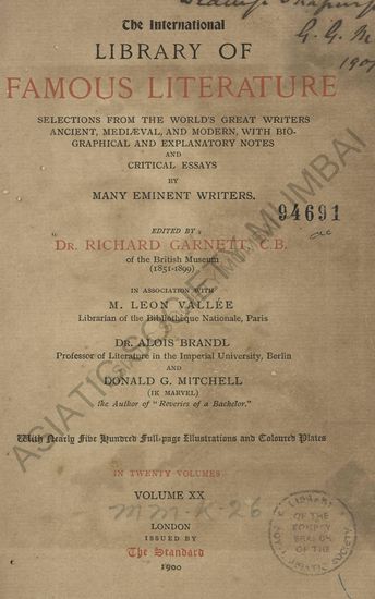 The International Library of Famous Literature Selections from the Worlds Great Writers Ancient Mediaval and Modern with Biographical and Explanatory Notes and Critical Essyas by many Eminent Writers, in Twenty Volumes, Vol. XX