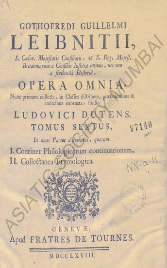 Opera Omnia nunc primum collecta, in classes distributa, praesationibus et indicibus exornata, studio Ludovici Dutens, Vol. VI- in duas Partes distributus, quaram, I. Continet Philologicorum continuationem; II. Collectanea Etymologica