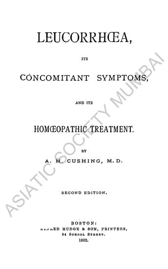 Leucorrhoea, its Concomitant Symptoms and its Homoeopathic Treatement, 2nd ed.