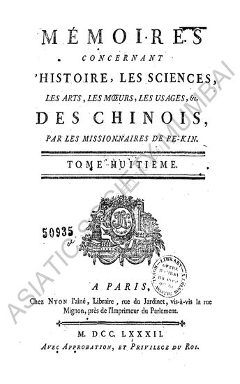 Memoires concernant l'Histoire, les Sciences, les Arts, les Moeurs, les Usages, &c. des Chinois, par les Missionnaires de Pe-Kin, Vol. VIII