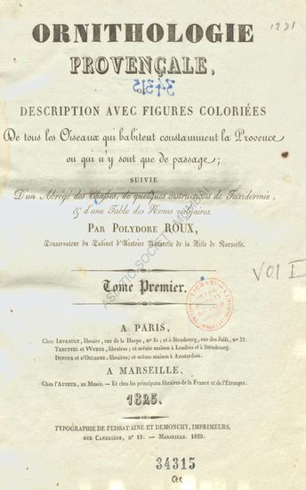 Ornithologie Provencale Description Avec Figures Coloriees De Tous Les Oiseaux Gui Habitent Constamment La Province Ou Quiny Sont Que De Passage, In Vol. 1 And Atlas To Vol.1