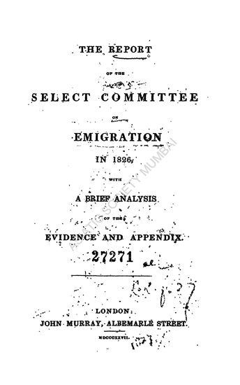 The Report of the Select Committee on Emigration in 1826 With A Brief Analysis of the Evidence and Appendix