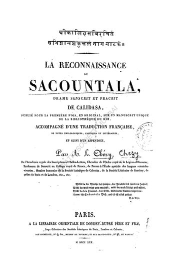 La Reconnaisaance Sacountala Drame Sanscrit Et Pracrit
