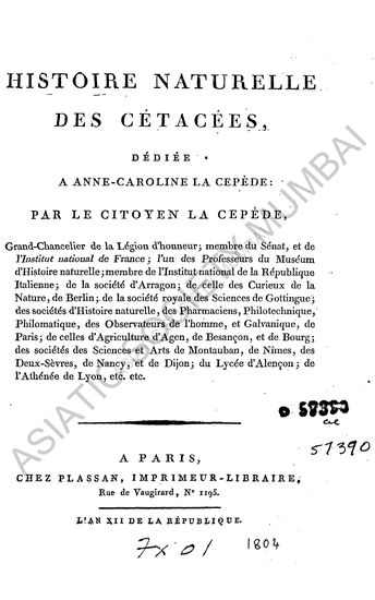 Histoire Naturelle, des Cetacees, dediee a Anne-Caroline la Cepede