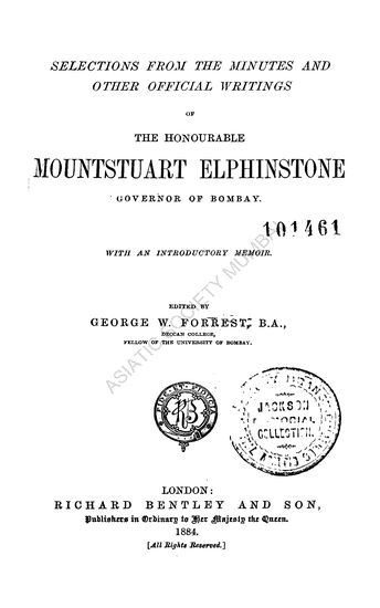 Selections From the Minutes and Others Official Writings of the Honourable Mountstuart Elphinstone